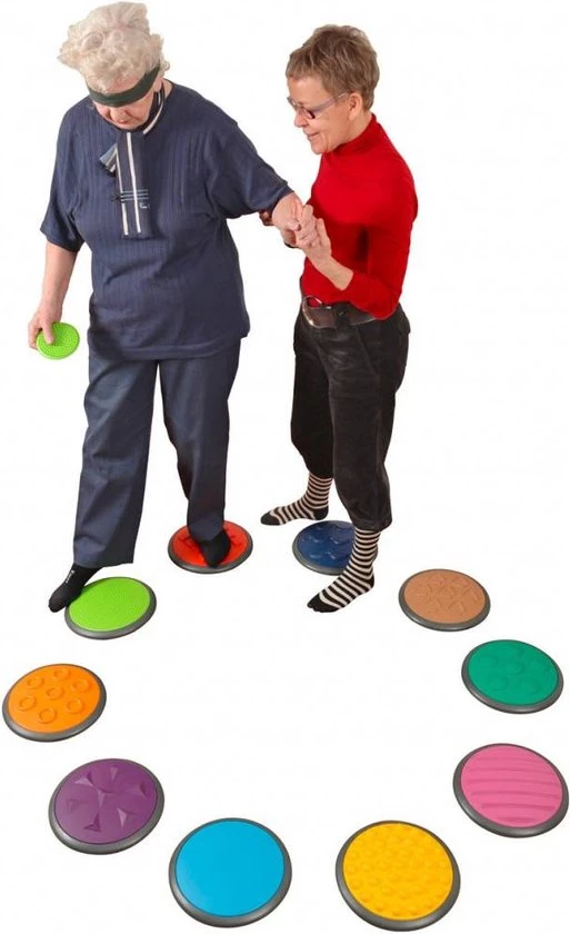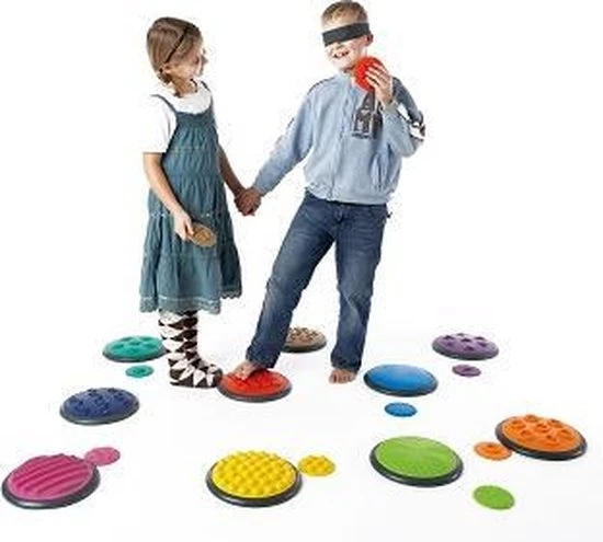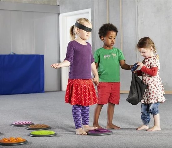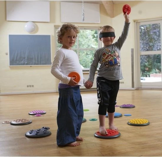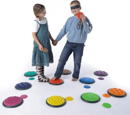 Aantrekkelijke set tactiele schijven, bedoeld om de tastzin op een speelse manier mee te ontwikkelen. De set bestaat uit vijf verschillende kleine schijfjes (? 11 cm.) met vijf bijpassende grote schijven (? 27 cm.) met dezelfde structuur. Doe de blinddoek om, pak een kleine schijf uit de meegeleverd zak en zoek (met handen of voeten) de bijpassende schijf. Dit spel biedt vele mogelijkheden om alleen of samen mee te spelen.