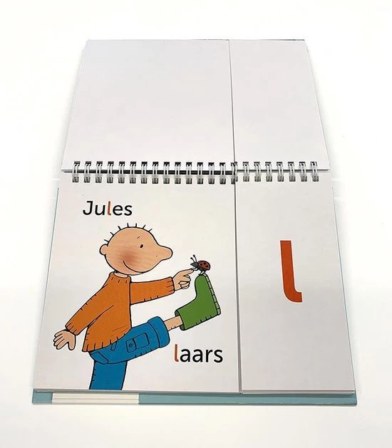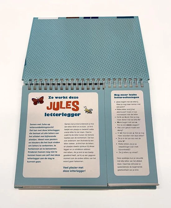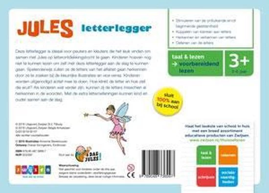 Samen met Jules op letterontdekkingstocht! Dat kan met deze Jules letterlegger, die bestaat uit alle letters van het alfabet met bijhorende plaatjes. Ideaal voor peuters en kleuters die het leuk vinden om letters te verkennen, herkennen en benoemen. Kinderen hoeven nog niet te kunnen lezen om zelf met deze letterlegger aan de slag te gaan. Ze kunnen de letters van het alfabet op een veelzijdige manier ontdekken. Hoe klinkt de letter en hoe ziet die eruit? Het kind bekijkt een plaatje en bedenkt welke rode letter hij daarbij ziet staan. Daarna zoekt het kind die letter tussen de kleinere kaartjes aan de rechterkant. Dat kan ook andersom: een illustratie bij een letter zoeken. Kinderen kunnen de letters en plaatjes steeds opnieuw bij elkaar leggen en zo eindeloos oefenen met letters. Als kinderen al een beetje geoefend hebben, zullen zij op een gegeven moment ook de andere letters van het woord gaan herkennen.