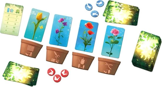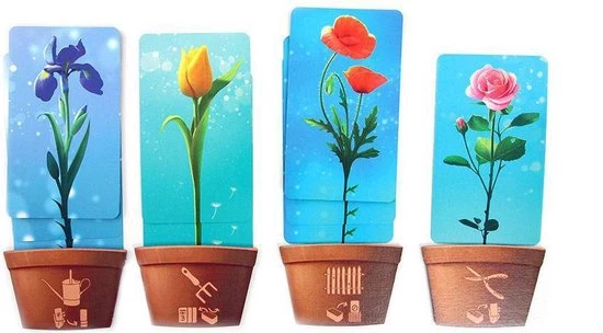 | Verpakkingsinhoud | 54, bloemkaarten, 1, scorekaart, 4, bloempottegels, 6, fiches, met, speciale, acties, en, spelregels. |