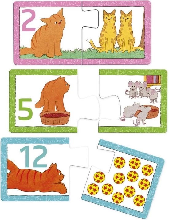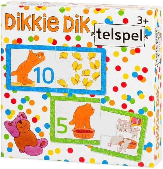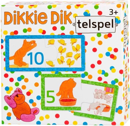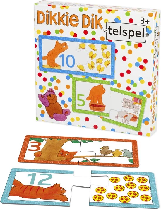 Het telspel is een puzzel waarbij kinderen op een speelse manier kennismaken met cijfers. Het spel bestaat uit 12 puzzels van elk 2 stukken, waarop de nummers 1 t/m 12 centraal staan. Natuurlijk ontbreken ook knuffelkat Dikkie Dik en zijn vriendjes niet op deze educatieve puzzels, dat maakt het voor kinderen extra leuk en herkenbaar. En voor ouders natuurlijk, want wie is er nou niet groot geworden met deze olijke oranje kater?