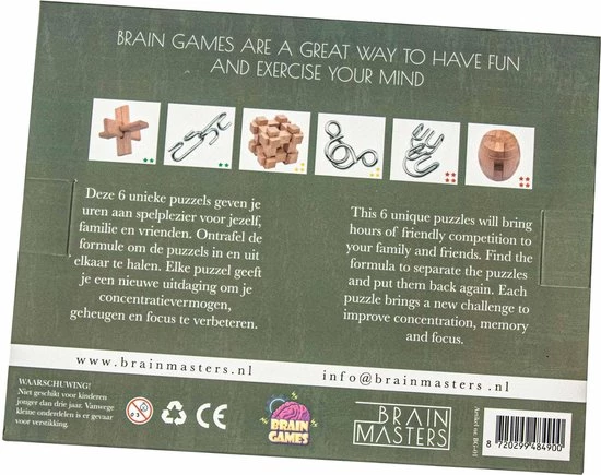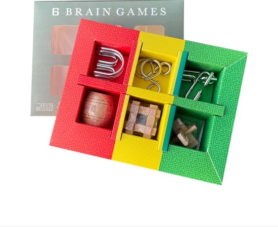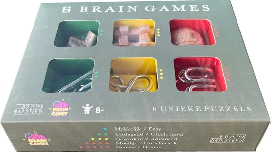 Kun jij ook geen genoeg krijgen van puzzelen en denk je dat jij onze nieuwe Brain Games aankunt? Deze 6 unieke puzzels geven je uren spelplezier voor jezelf, familie en vrienden. Ontrafel de formule om de puzzels in en uit elkaar te halen. Elke puzzel geeft je een nieuwe uitdaging om je concentratievermogen, geheugen en focus te verbeteren. Klinkt makkelijk toch? Pas maar op, het is moeilijker dan het er uit ziet.