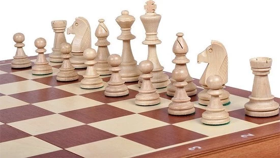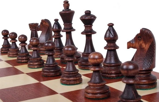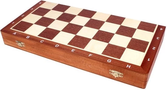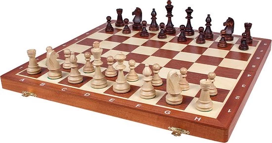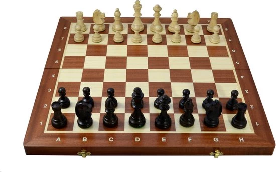 Koningshoogte: 10 cm. De witte vierkanten zijn gedrukt op het schaakbord. Het inklapbare schaakbord is gemaakt van mahonie- en plataanhout. Met een veldmaat van 58 mm en bijpassende stukken valt dit bord binnen de voorgeschreven richtlijnen van de FIDE (de wereldschaakbond). Een echt professioneel schaakspel!
