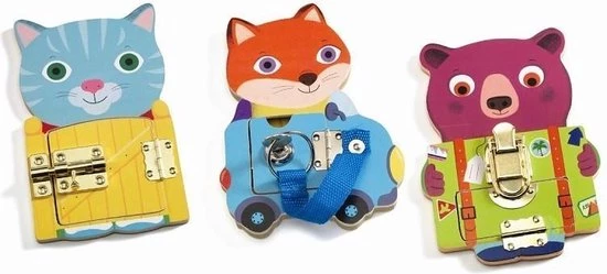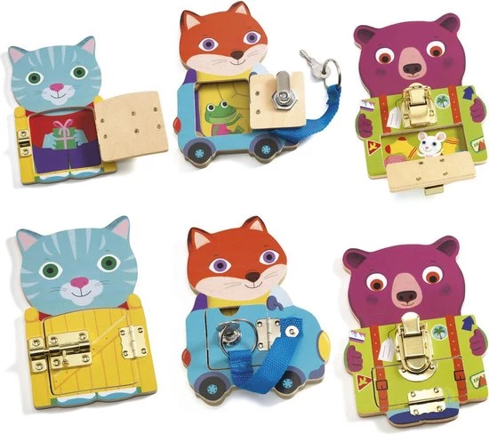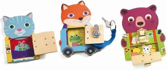 Met Locktou van Djeco leert je kleintje op een speelse wijze verschillende sluitingen open en dicht te maken. De drie houten dieren hebben elk een eigen slot die op verschillende manieren geopend en gesloten kunnen worden. Zo moet je bij de kat een hek openen, bij de vos een autodeur met een sleutel en bij de beer een koffertje.