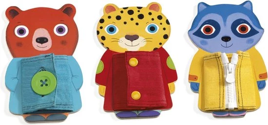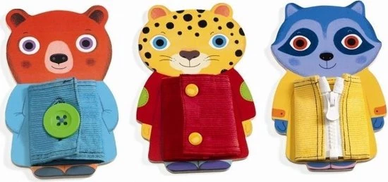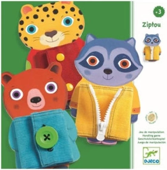 Met Ziptou van Djeco leert je kleintje op een speelse wijze verschillende sluitingen open en dicht te maken. De drie houten dieren hebben elk een jasje aan die op verschillende manieren geopend en gesloten kunnen worden. Zo heeft de beer een knoop met knoopsgat, de tijger heeft drukknoopjes en de wasbeer heeft een rits.