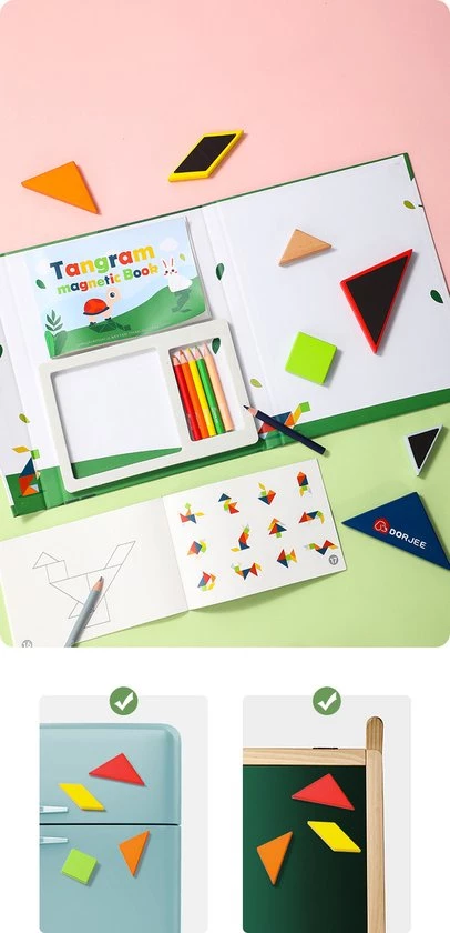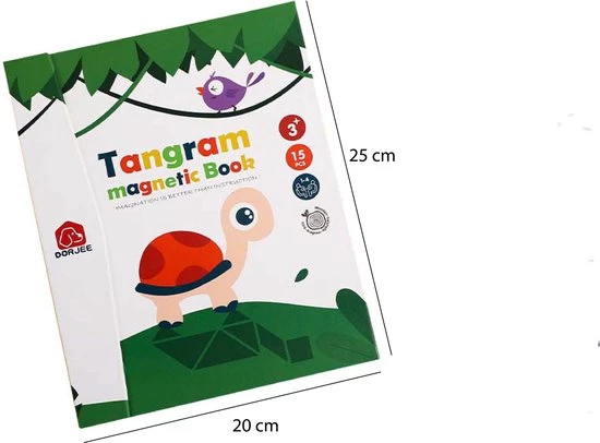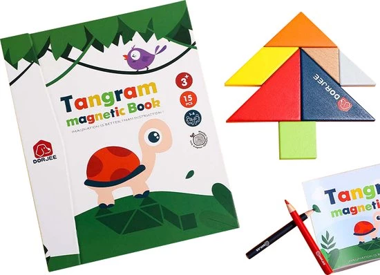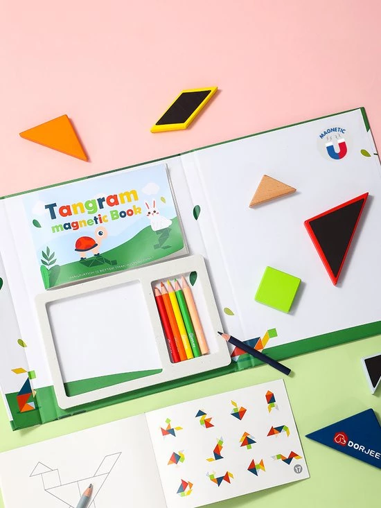 Met dit magnetische tangram puzzel boek kan je het spel ook gemakkelijk mee nemen. Je speelt het in het in het boekje waar de magnetische puzzelstukjes gemakkelijk blijven zitten. Het spel komt met een verschillende puzzelopdrachten, tangram puzzel stukjes, enkele kleurplaatjes en 7 kleurpotloden.
