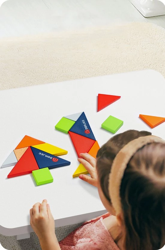 Met het spelen van Tangram maken kinderen kennis met de wiskundige vormen zoals vierkant, driehoek en parallelogram. Ze leren de vormen herkennen vanuit de abstrace puzzelopdrachten. Ontwikkeld creativiteit, logisch denken en ruimtelijk inzicht.