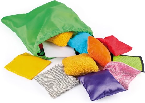 Door deze sensorische pittenzakken te voelen kunnen kinderen 2 met dezelfde structuur en vulling bij elkaar zoeken. 10 set van 2 pittenzakken. Afmeting: 9 x 9 cm. Materialen: stof, polyester, kunstleer, nylon en PE granulaat. N