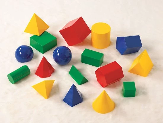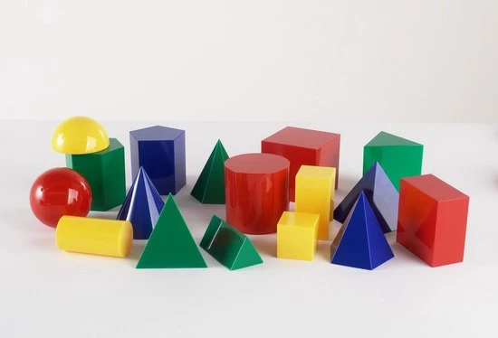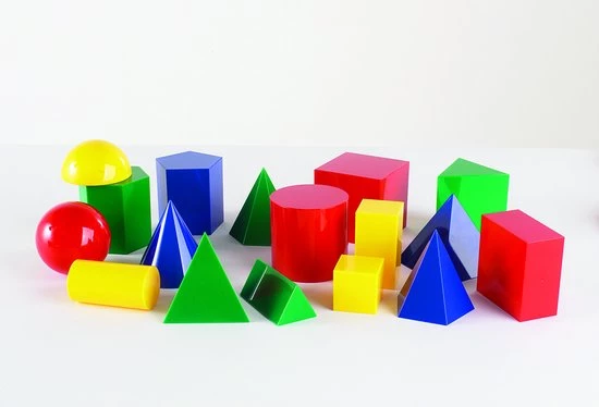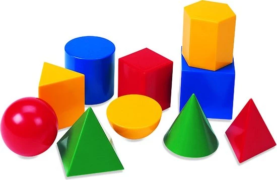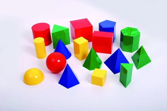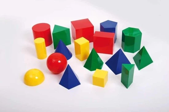 Heldere grote plastic geometrische vormen in 4 kleuren om het leren van geometrische relaties tussen oppervlakte, volume, vorm, vorm en grootte te inspireren. 17 vormen omvatten: grote en kleine kubussen, kegel, bol, halve bol, vierkante/rechthoekige/zeshoekige en vijfhoekige prisma’s, grote en kleine driehoekige prisma’s, grote en kleine cilinders, driehoekige/vierkante/zeshoekige/vijfhoekige piramides.