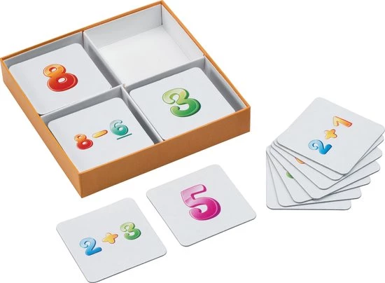 Op de ene helft van de kaartjes staan verschillende sommen afgebeeld, op de andere helft de bijbehorende antwoorden.
