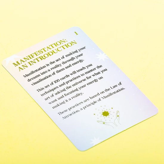 Manifest Lifestyle kaarten van Gift Republic. Set van honderd kaarten met technieken en oefeningen om te leren manifesteren. Met deze techniek leer je hoe je het universum vraagt je te helpen om je dromen uit te laten komen. De teksten zijn geschreven in het Engels. Afmeting verpakking: 15 x 9 x 4 centimeter.
