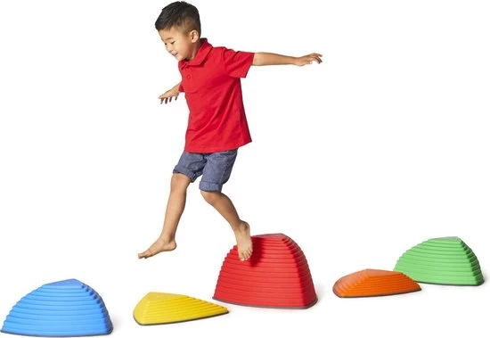 De Rivierstenen zijn ge?nspireerd op stapstenen in een rivier waarbij elke zijde van de driehoek varieert in steilheid en moeilijkheidsgraad. Het doel is om van steen naar steen te springen zonder de vloer aan te raken – u kunt de positie van de stenen vari?ren om meer uitdagende paden voor kinderen te cre?ren. Elke steen heeft een rubberen rand aan de basis die voorkomt dat ze wegglijden, actief en fantasierijke plezier. Bouwt het vertrouwen van kinderen op tijdens het springen, het beoordelen van afstand, co?rdiren en balanceren. Verbeterd ontwerp van de originele Rivierstenen.