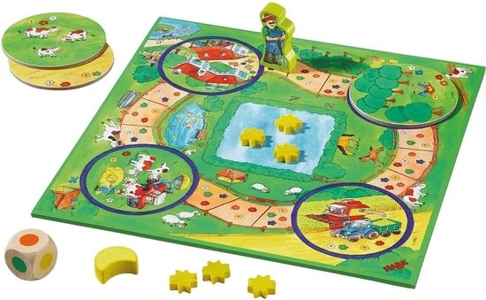 3 paarden, 3 koeien, 3 varkens, 3 schapen, 2 rode appels, 2 pruimen, 2 eieren, 2 kaaspuntjes, 2 slablaadjes, 2 worteltjes, 1 boer, 1 ogendobbelsteen, 1 kleurendobbelsteen, 9 sterren, 1 maan, 1 handleiding