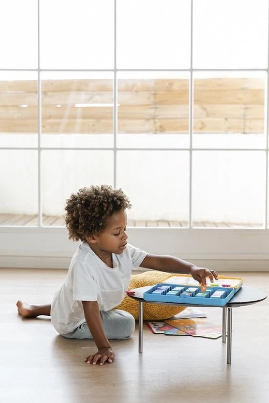 In het begin zullen kinderen nog enige begeleiding nodig hebben bij het uitzoeken van de kaarten en het begrijpen van de opdrachten, maar door het blokjes systeem zullen zij al snel zelf aan de slag kunnen! De blokjes met getallen liggen op volgorde, met de blokjes met symbolen als laatste. Voor elk getal zijn er blokjes in verschillende kleuren; de symbolen hebben maar ????n kleur (paars). Elk cijferblokje heeft een speciale achterkant, waardoor deze maar op ????n plek op de opdrachtkaarten past. Door de kleur en de speciale achterkant van de blokjes, past het alleen op de juiste plek. Zo weten kinderen gelijk of zij het antwoord goed hebben!