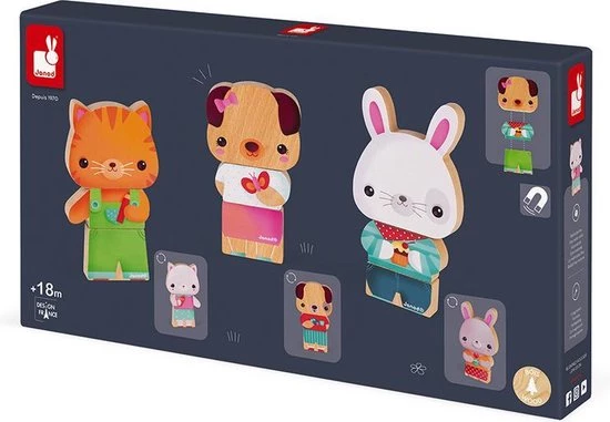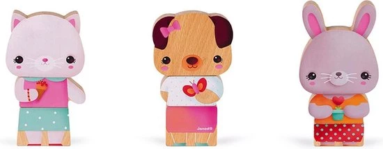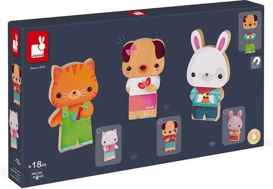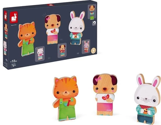 Houten speelgoed. Voor kinderen van 18 tot 36 maanden. 3 dieren in 3 magnetische delen: loshalen, creatief mixen en weer samenvoegen. Een leuk combinatie- en verbeeldingsspel.