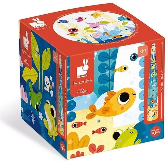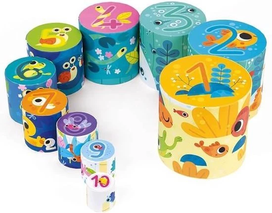 Kartonnen stapeltoren met 10 te stapelen elementen om een schitterende piramide te bouwen in het thema het leven in de vijver.. Op de bovenkant van elk element bevindt zich een cijfer. Met deze piramide leert uw kind tot 10 tellen en ontwikkelt hij zijn motoriek en verbeeldingskracht op een leuke manier! Geschikt voor kinderen vanaf 12 maanden.