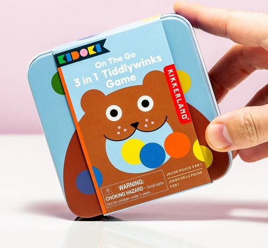 Vlooienspel in een blikje van Kikkerland. Spelletje waarbij kleuters de plastic vlooien in de opening moeten zien te wippen. De bijbehorende kaartjes hebben verschillende openingen, zoals een beer met geopende mond. Verpakt in een blikje, waardoor je het ook mee kan nemen. Dit product is onderdeel van de KIDOKI collectie van Kikkerland. Afmeting: 10,2 x 10,2 x 4 centimeter.