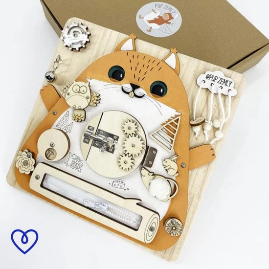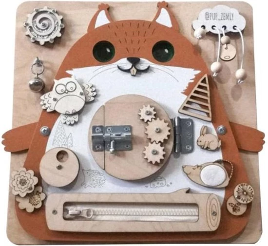 Met dit mooie houten activiteitenbord kunt u kleuter spelenderwijs leren en ontdekken. Op dit leuke eekhoorn bord is van alles te ontdekken. Je kleintje kan schuiven, draaien, drukken, en ritsen aan alles wat los en vast zit. Jouw kindje kan aan de tandwielen draaien, maar ook verschillende slotjes openbreken. Stimuleer spelenderwijs de fijne motoriek en de concentratie van jouw peuter. Er valt genoeg te ontdekken en te leren met dit mooie eekhoorn bord!