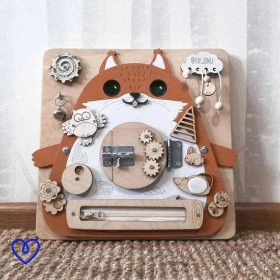 Laat uw kleuters en peuters spelenderwijs leren en ontdekken. Op dit leuke eekhoorn bord is van alles te ontdekken. Je kleintje kan schuiven, draaien, drukken, en ritsen aan alles wat los en vast zit. Jouw kindje kan aan de tandwielen draaien, maar ook verschillende slotjes openbreken. Stimuleer spelenderwijs de fijne motoriek en de concentratie van jouw peuter. Er valt genoeg te ontdekken en te leren met dit mooie eekhoorn bord!