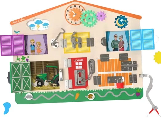 Ontwikkel al spelend het gevoel en bewustzijn van je kind door hem of haar met het Slotenbord spel te laten spelen! Een kleurrijk spel waar je kind behendigheid krijgt in het omgaan met sluitingen en sloten, kennis gaat maken met cijfers en de klok en het kan gaan spelen of het dag of nacht is. Heeft jouw kind het slot open dan zijn daar opa en oma, papa en mama of verschillende dieren zoals kippen, koeien, een paard of eenden. Jouw kind kan zijn of haar fantasie heerlijk laten gaan met het Max & Lea slotenbord spel. Het spel weegt 1480 gram en is 44×35 centimeter.