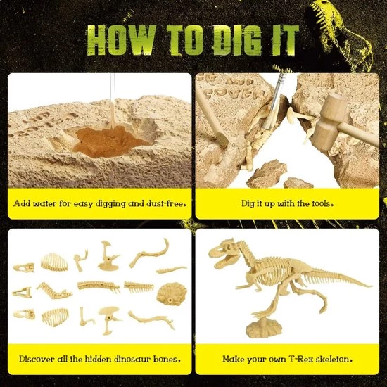 - VERBETER DE HAND-ON ACTIVITEIT: er is niet alleen een kind nodig om te graven als een paleotoloog maar het vereist ook een kind om de dinosuar met de hand in elkaar te zetten. Een geweldige kit voor het verbeteren van de praktische activiteit van kinderen in de moderne samenleving wanneer kinderen worden gedomineerd door mobiele telefoons en andere elektronische producten.