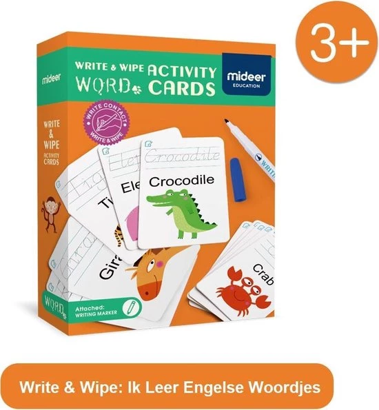 Met de meegeleverde droge uitwisbare stift zullen kinderen de letters en Engelse woordjes onder de knie krijgen.