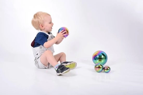 Het color burst-effect zorgt voor een spectrum van heldere metallic tinten op elke bal, met een fascinerende reflectie die vervormt als een fish-eye-lens om kinderen een intrigerend beeld van zichzelf en hun omgeving te geven.