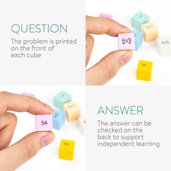 - VOOR- EN ACHTERKANT: De vermeningvuldigingen van de tafels 1 tot en met 10 staan op de voorkant van de blokjes. Draai ze simpelweg om, om de antwoorden te bekijken.