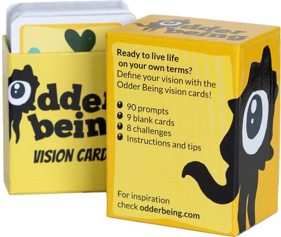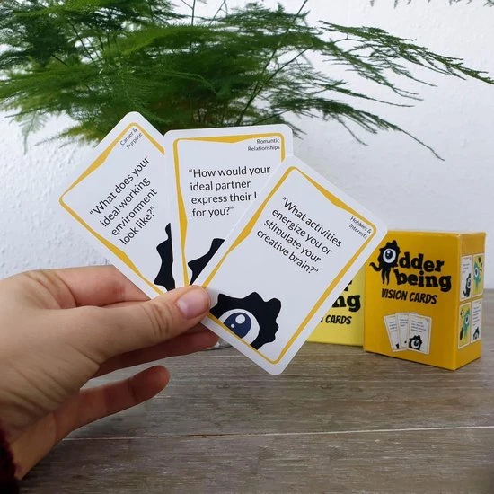 Dat is precies waar de Odder Being Vision Boarding-kaarten voor zijn gemaakt. Je krijgt 90 vragen die een coach jou ook zou stellen om na te denken over wat je nou precies van je leven wilt. De antwoorden kun je gebruiken voor je eigen vision board (dat is wat wij ermee doen, en daar helpen we jou ook graag bij), maar ook voor bijvoorbeeld meditatie of journaling. Leuk in je eentje, maar ook voor je Lean In-cirkel, mastermind, intervisie of vriendengroep.