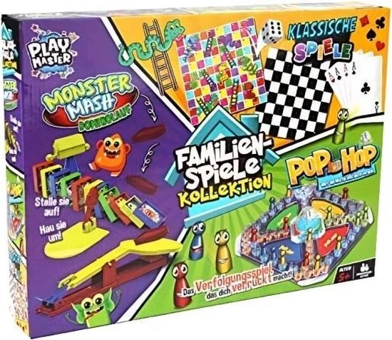 Met deze spelbox van Play Master beschik je ineens over vijf spellen in één doos! Met deze spelbox kun je de volgende spellen spelen: pop en hop, dammen, slangen en ladders en Monster Mash domino. Ten slotte bevat de spelbox ook nog één stok kaarten. Hier kun je natuurlijk verschillende spellen mee spelen. De box is in het Duits, maar de spellen kunnen gespeeld worden ongeacht welke taal je spreekt. Speelplezier gegarandeerd!