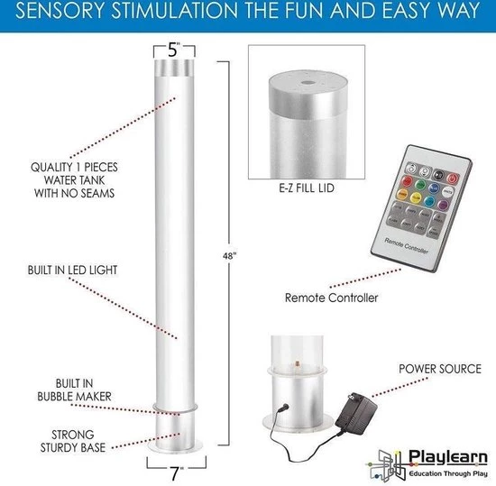 Afgezien van het verfraaien van uw ruimte, is dit Sensory Bubble Tube Aquarium ook educatief. Kijken naar de vissen die op en neer drijven, bevordert de vaardigheden van kinderen om objecten te volgen, terwijl het zien van de lichten die afwisselen tussen verschillende kleuren de kleurherkenning verbetert. De repetitieve bewegingen van de bubbels en vissen met afwisselende kleuren en het zachte gezoem van de machine bieden de perfecte stimulatie voor personen met speciale behoeften, autisme, ADHD en dementie, en passen precies in sensorische kamers, scholen en verpleeghuizen.