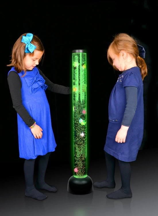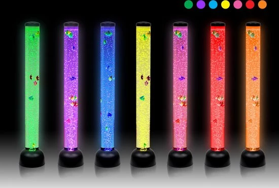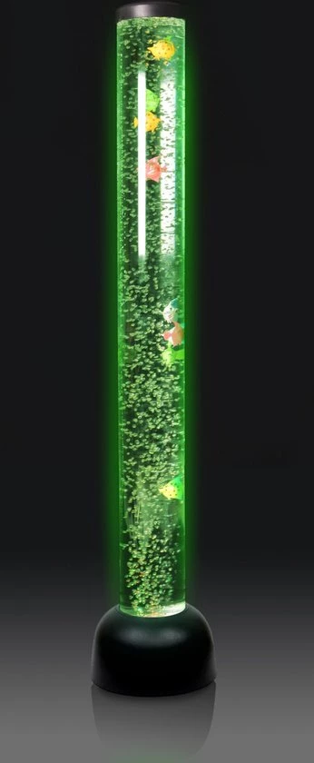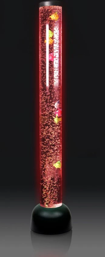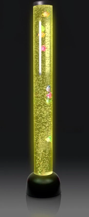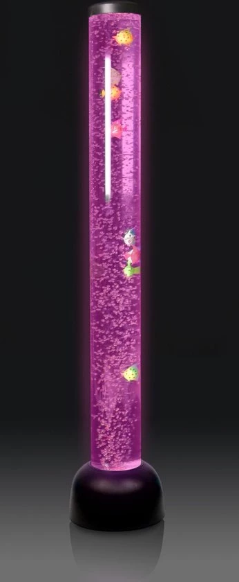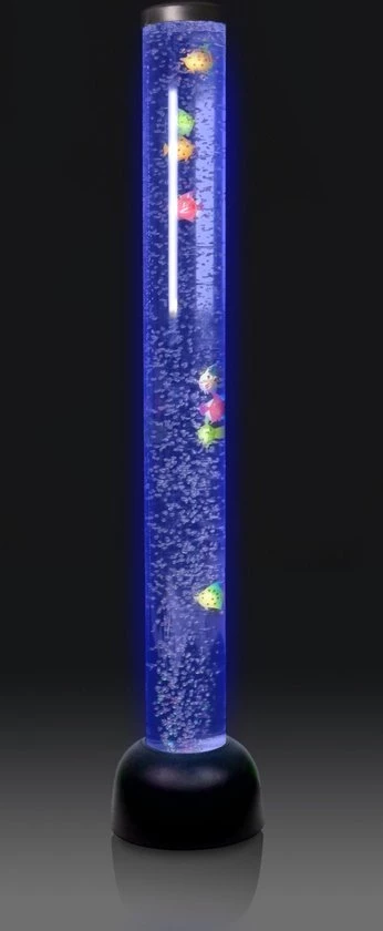 Een bubbelbuis / snoezellamp van 105 cm met verlichting met kleurverandering, bubbels, ballen en zwemmende vissen. Ideaal voor elk klaslokaal of sensorische zone. Biedt een afleidingsactiviteit. Met witte kunststof voet.