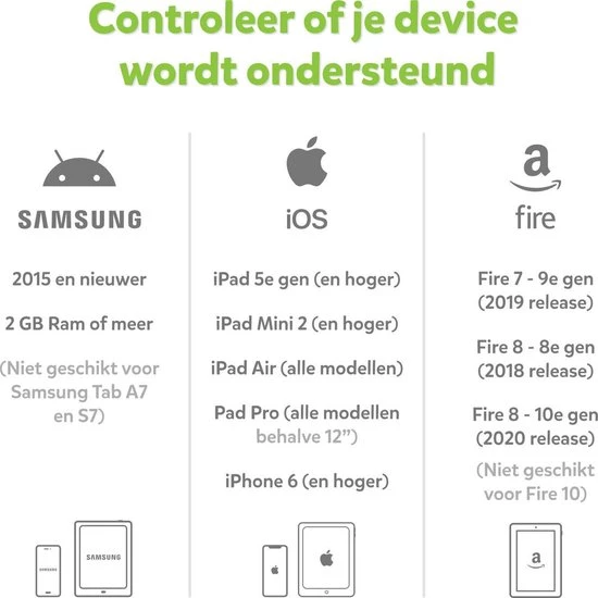 iPad 3rd Gen en hoger, iPad Air (alle modellen), iPad Pro (alle modellen behalve Pro 12”), iPad Mini 2 en hoger, iPhone 6 en hoger, Samsung apparaten 2015 en nieuwer met 2 GB RAM of hoger, Android 6 en hoger met minimaal 2 GB RAM.