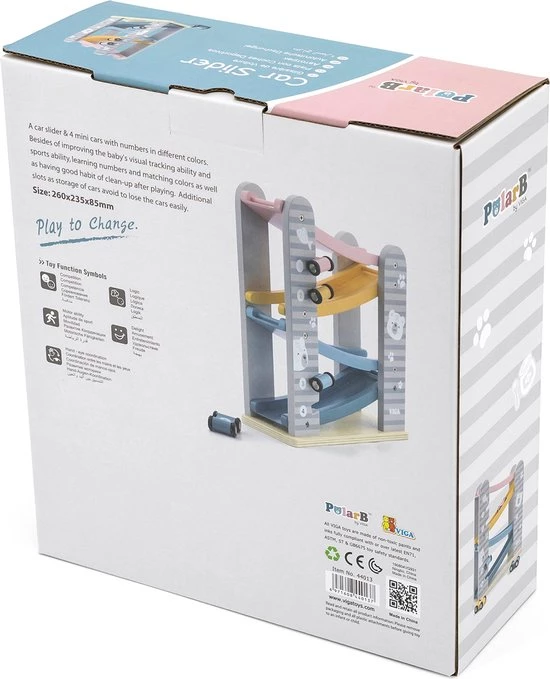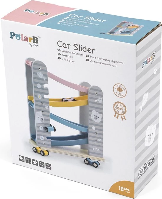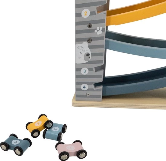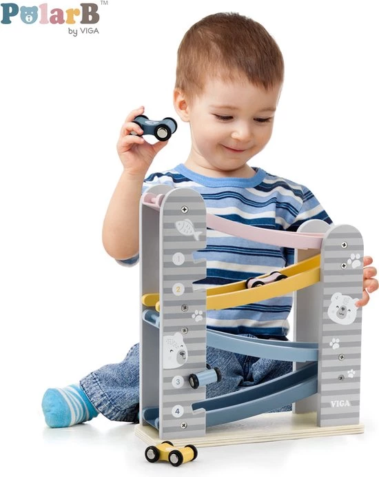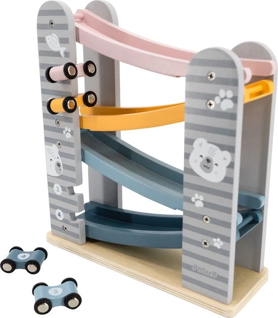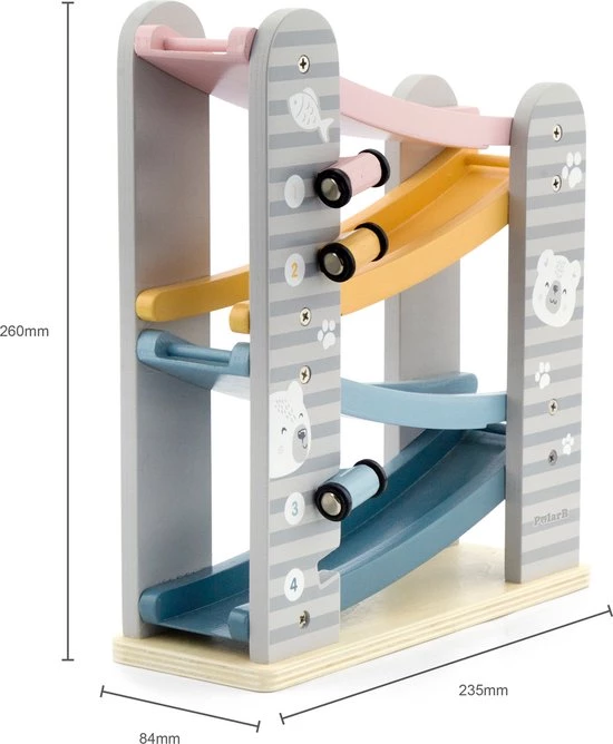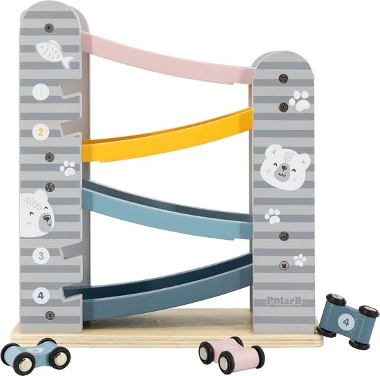 PolarB houten autobaan is een leuke autobaan in zachte kleuren met bijbehorende raceauto’s die helemaal naar beneden gaan als je ze van bovenaf loslaat.
