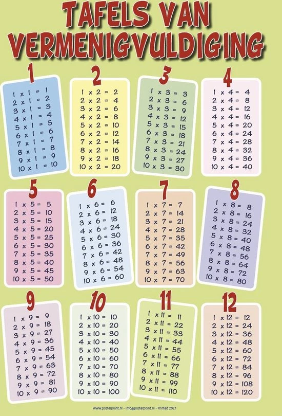 Poster met de tafels van vermenigvuldigen van 1 tot 12. Praktisch, decoratief, educatief voor kinderen om de tafels van vermenigvuldiging te leren in het formaat 50x70cm.