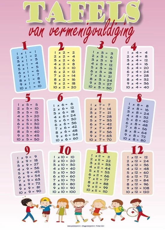 Poster met de tafels van vermenigvuldigen van 1 tot 12. Praktisch, decoratief, educatief voor kinderen om de tafels van vermenigvuldiging te leren in het formaat 50x70cm.
