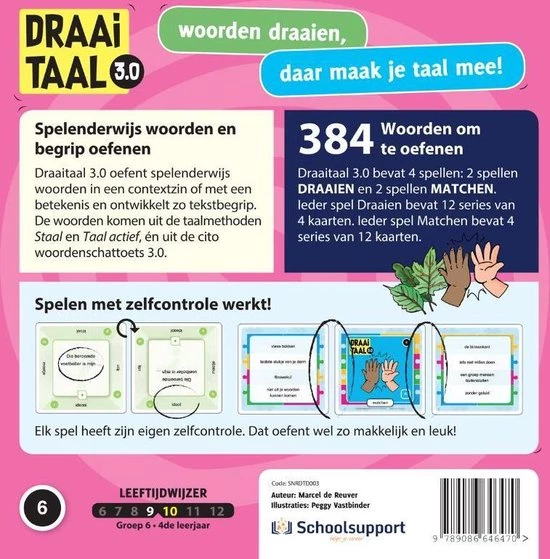 Met DraaiTaal 3.0 groep 6 breiden kinderen in groep 6 spelenderwijs hun woordenschat uit. Met de woordenkeuze sluiten we aan bij zowel de nieuwste citotoetsen Woordenschat als de meest gebruikte taalmethoden, Staal en Taal actief.