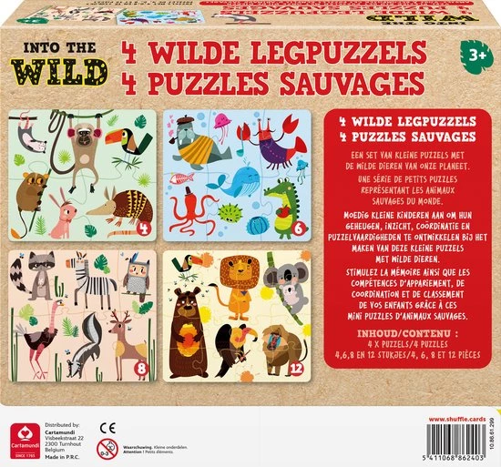 Vinden je kinderen puzzelen ook zo ontzettend leuk? In deze Into the Wild puzzeldoos zitten maar liefst vier legpuzzels! Lukt het ze om alle afbeeldingen met wilde dieren compleet te maken? Het pakket bevat 4 puzzels: een puzzel van vier, zes, acht en twaalf stukjes. Veel succes en plezier!