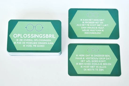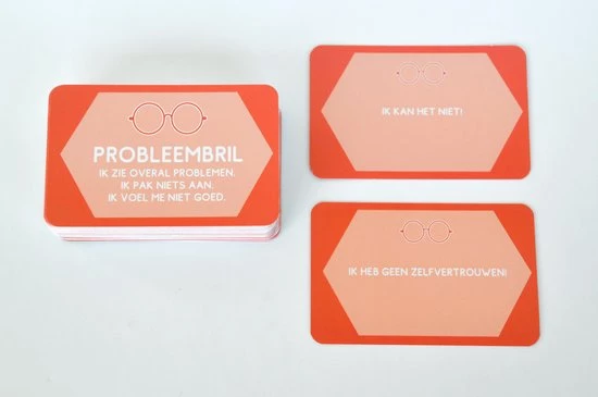Neem de set kaarten en leg ze met de rode bril naar boven. Herkent het kind of de jongere een rodebrilgedachte? Hou de kaart dan bij. Laat het kind of de jongere nadien een oplossing bedenken voor de probleemversterkende gedachte. Zo train je het oplossingsgericht denken en wordt het een automatisme.