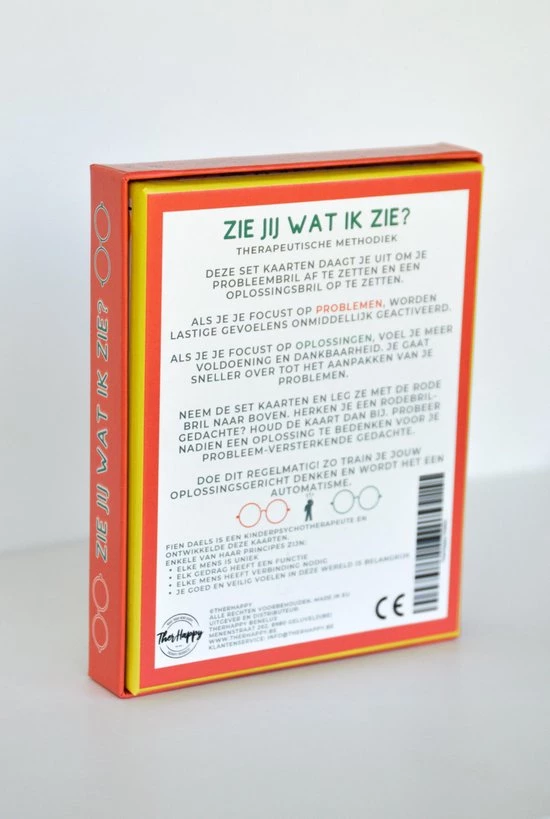 Dan is de therapeutische methodiek van ‘Zie jij wat ik zie?’ zeker behulpzaam. Deze set kaarten daagt kinderen uit om in oplossingen in plaats van problemen te denken. Als je je focust op problemen, worden lastige gevoelens onmiddellijk geactiveerd. Focus je je op oplossingen? Dan voel je meer voldoening en dankbaarheid. Op die manier ga je sneller over tot het aanpakken van je problemen.