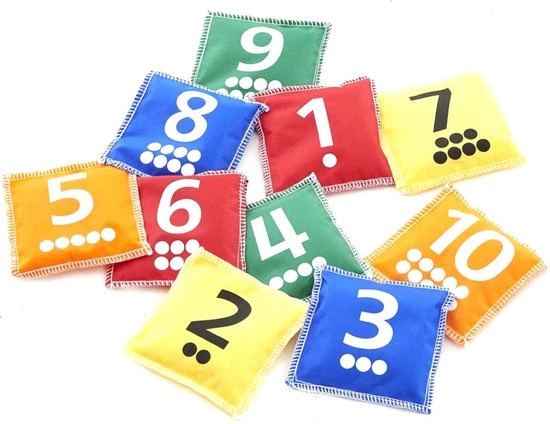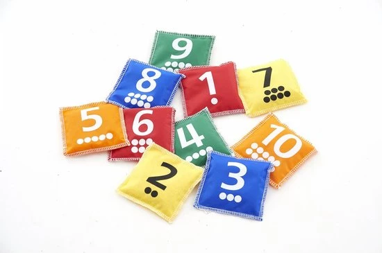 Gebruik de pittenzakken om de kinderen spelenderwijs te leren tellen en herkennen van cijfers. Afmeting: 100 mm. Geschikt vanaf 3 jaar.