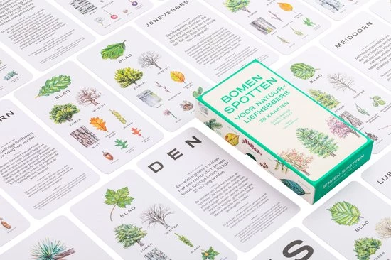 Last van bomenblindheid? Met deze flashcards ontdek je hoe je het blad herkent en zo leer je de verschillen tussen boomsoorten razendsnel kennen. Gebruik de kaarten om je favoriete bomen te identificeren of geef jezelf een nieuwe uitdaging: kun jij een paardenkastanje herkennen aan het blad of moet je eerst glimmende kas- tanjes zien liggen voor het kwartje valt? Elke kaart bevat gedetailleerde afbeeldingen, plus fascinerende feiten over alle getoonde bomen.