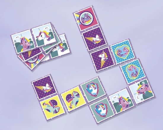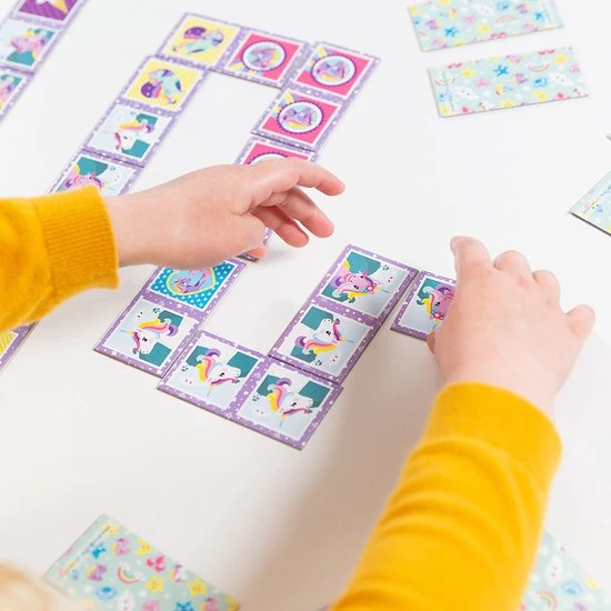 Speel het klassieke dominospel nu met een leuk eenhoorn thema! De kaarten bevatten verschillende eenhoorns. Verbind de kaartjes door dezelfde plaatjes aan elkaar te koppelen. Speelplezier gegarandeerd!