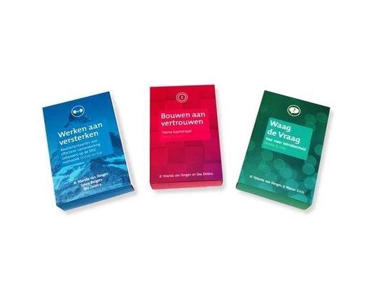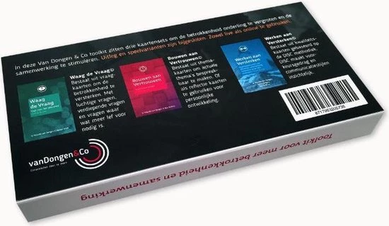 De Van Dongen & Co. toolkit voor meer betrokkenheid en samenwerking – bestaat uit 3 kaartensets voor meer betrokkenheid en effectieve samenwerking. ?Bouwen aan Vertrouwen??- themakaarten om dat wat er speelt binnen teams of tussen medewerkers laagdrempelig bespreekbaar te maken. ?Werken aan Versterken??- kwaliteitenkaarten om zicht te krijgen op je eigen kwaliteiten en die van collega?s. Gebaseerd op de DISC methodiek. ‘Waag de Vraag?’ – vraagkaarten voor betrokkenheid en samenwerking.