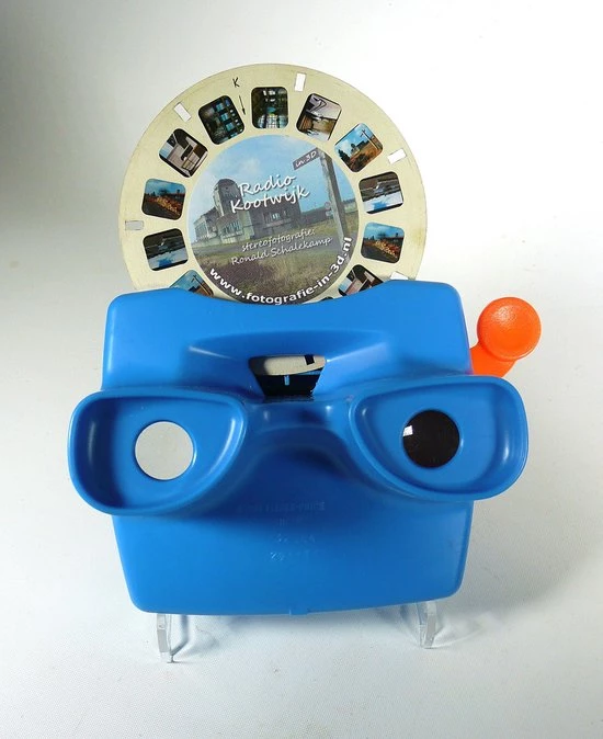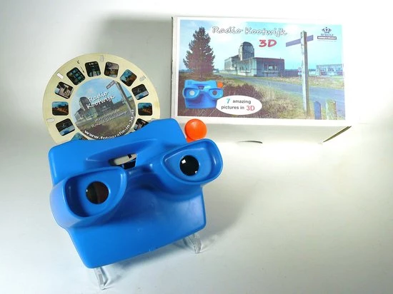 Een fraaie set van Viewmaster viewer en schijf in doos, met 7 3D foto’s van Radio Kootwijk. Het bijzondere gebouw is in de viewer in 3D te bekijken.