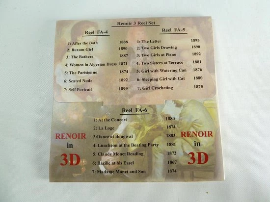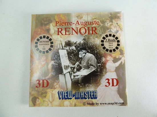 Unieke conversie van 21 schilderijen van Renoir in 3D. De schilderijen van de 19e eeuwse Franse schilder komen werkelijk tot leven in de meegeleverde viewmaster viewer. Prachtige 3D effecten en kleuren.