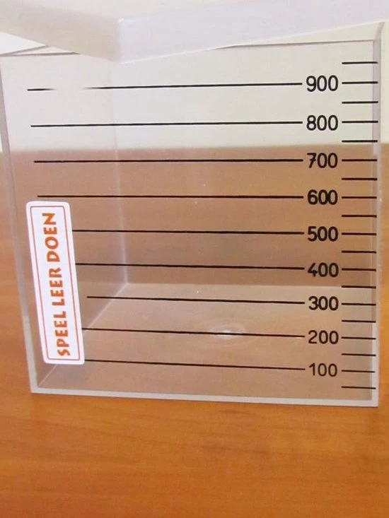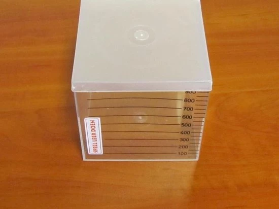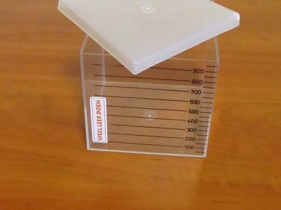 Deze vierkante witte doorzichtige bak 10 cm x 10 xm x 10 cm is precies 1 liter.