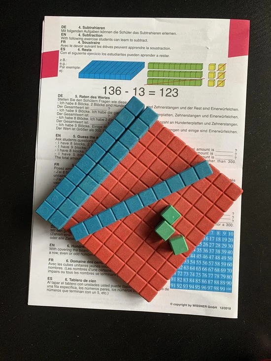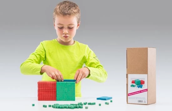 Rekenen met MAB materiaal maakt rekensommen visueel en inzichtelijk. Het helpt bij het begrijpen van de getalstructuur voor een beter getalbegrip. Deze Montessori-set is 121 delig en bestaat uit: