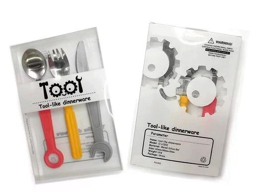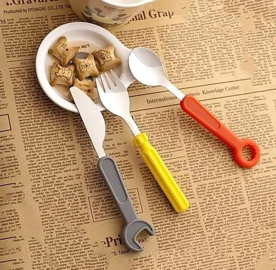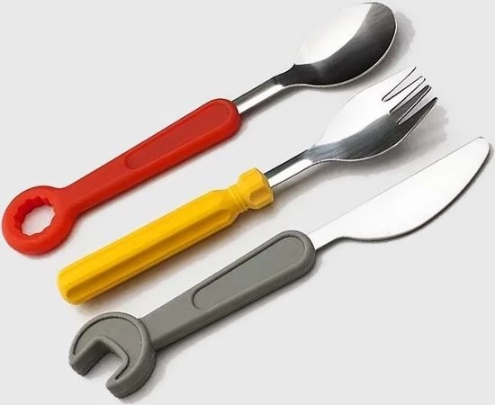 Deze bestekset met een vork, mes en lepel is een leuk kadootje dat ook nog eens nuttig is. Het lijkt op een setje gereedschap. Gemaakt uit roestvrijstaal en kunststof (handvat).